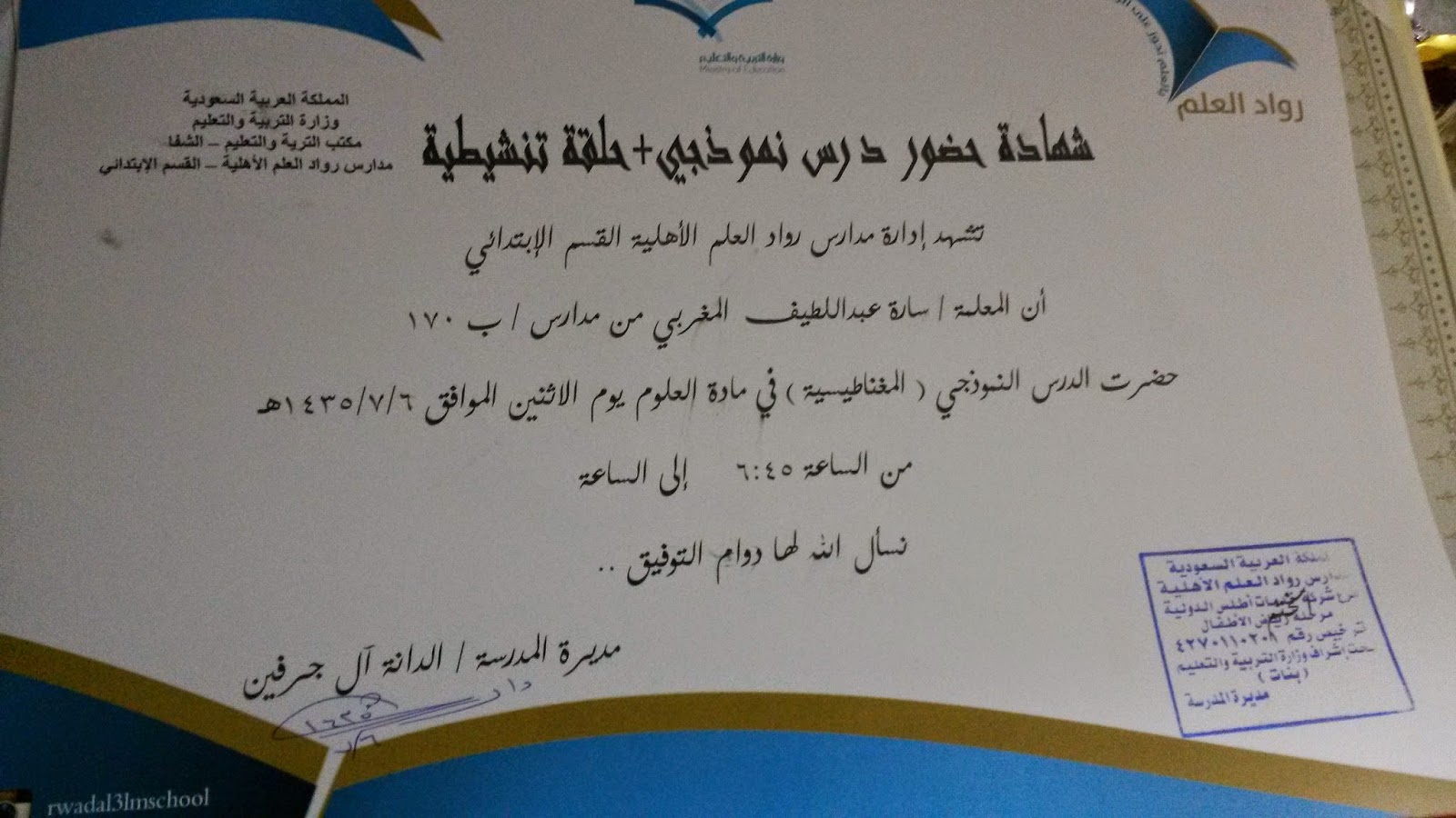 شهادة شكر وتقدير للإبداع في عرض ركن إنجازات الطالبات وحصولي على المركز الثالث ملف الانجاز الالكتروني لمادة الحاسب الالي